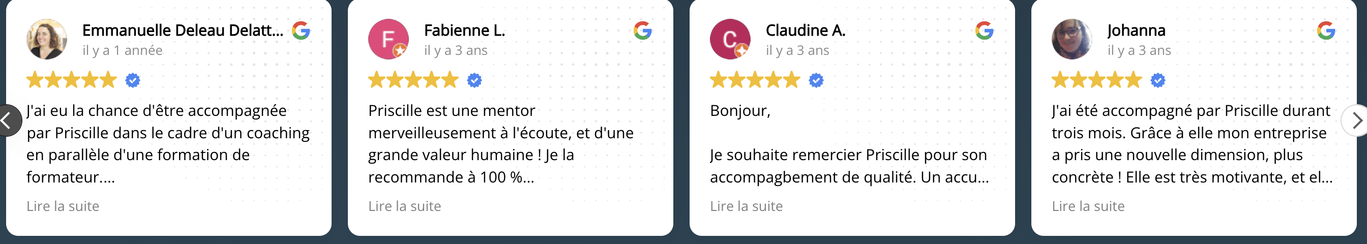 Publié sur Alyson LASCAUXTrustindex vérifie que la source originale de l'avis est Google. Priscille a été mon mentor pendant ma formation en marketing digital. Nous nous sommes découvert un grand point commun : la lecture ! Elle m’a accompagnée dans la refonte de ma page Instagram d’auteure indépendante, m’a conseillée pour le lancement de mon activité, et elle m’a même permis de relancer l’écriture de mes prochains romans. Je suis venue avec mes questions, mes inquiétudes… Priscille a su répondre à chacune d’elles avec clarté. Ces trois mois sont passés beaucoup trop vite. À l’écoute, humaine, bienveillante, professionnelle, et dotée de tant d’autres qualités : n’hésitez pas à faire appel à elle. Encore un grand merci, Priscille !Publié sur Emmanuelle Deleau DelattreTrustindex vérifie que la source originale de l'avis est Google. J'ai eu la chance d'être accompagnée par Priscille dans le cadre d'un coaching en parallèle d'une formation de formateur. Je suis extrêmement satisfaite de son accompagnement : au delà son excellente écoute et disponibilité, Priscille dispose d'une vision pragmatique, bienveillante sans être complaisante. J'ai eu beaucoup de plaisir à la retrouver à chacune de nos rencontres. Elle a vraiment participé au lancement de serein de mon activité ! Je la recommande !Publié sur Fabienne L.Trustindex vérifie que la source originale de l'avis est Google. Priscille est une mentor merveilleusement à l'écoute, et d'une grande valeur humaine ! Je la recommande à 100 % En ce qui me concerne, elle a fait une vraie différence dans mon parcours :-)Publié sur Claudine A.Trustindex vérifie que la source originale de l'avis est Google. Bonjour, Je souhaite remercier Priscille pour son accompagbement de qualité. Un accueil toujours agréable, une capacité d'écoute bienveillante énorme et des conseils toujours si pertinents que je me demandais parfois si Priscille n'était pas déjà spécialiste de mon domaine! En tout cas, à chacun de mes entretiens avec elle, j'ai obtenu davantage de clarté sur le chemin à parcourir et une vision challengeante et réalisable des prochaines étapes. J'appréhendais la fin de son accompagnement mais elle m'a tellement bien accompagnée vers la sortie, a si bien préservé mon autonomie qu'aujourd'hui encore j'avance vers l'aboutissement de mon projet avec confiance. Ses conseils résonnent encore à mes oreilles. Alors un grand merci à toi Priscille!Publié sur JohannaTrustindex vérifie que la source originale de l'avis est Google. J'ai été accompagné par Priscille durant trois mois. Grâce à elle mon entreprise a pris une nouvelle dimension, plus concrète ! Elle est très motivante, et elle a de très bonnes idées. J'ai découvert le marketing digital à ses côtés. Ce fût une super expérience pour moi. Merci à toi PriscillePublié sur Laurence AsquinTrustindex vérifie que la source originale de l'avis est Google. Un grand merci à Priscille pour cet accompagnement de qualité. Une personne agréable, à l'écoute, très positive et de bon conseil. Je recommande vivement.Publié sur Le bon VoisinTrustindex vérifie que la source originale de l'avis est Google. Priscille est à l’écoute et trouve toujours des solutions, un plaisir de travailler avec elle 😊Publié sur Krystel LE NEGARETTrustindex vérifie que la source originale de l'avis est Google. Un grand merci à Priscille pour nos échanges. Félicitations pour son écoute active et sa bienveillance. Garder à l'esprit le "power patate". Je vous recommande Priscille, elle vous en dira plus..😀Publié sur Karine Betton-DuhamelTrustindex vérifie que la source originale de l'avis est Google. Un grand merci à Priscille qui m'a accompagné sur ma formation, et qui m'a apporté tellement plus qu'un accompagnement de mentor ! Merci de m'avoir permis de me "retrouver" et d'avoir pu poser des mots sur mes envies !Publié sur chat inspireTrustindex vérifie que la source originale de l'avis est Google. Priscille est une personne très attentive à vos questions, et trouve toujours des réponses à vos question. Je me souviendrai très longtemps de nos conversations et de son écoute attentive. j’espère encore avoir l'occasion de parler avec elle en tout cas vous pouvez lui faire confiance les yeux fermés.